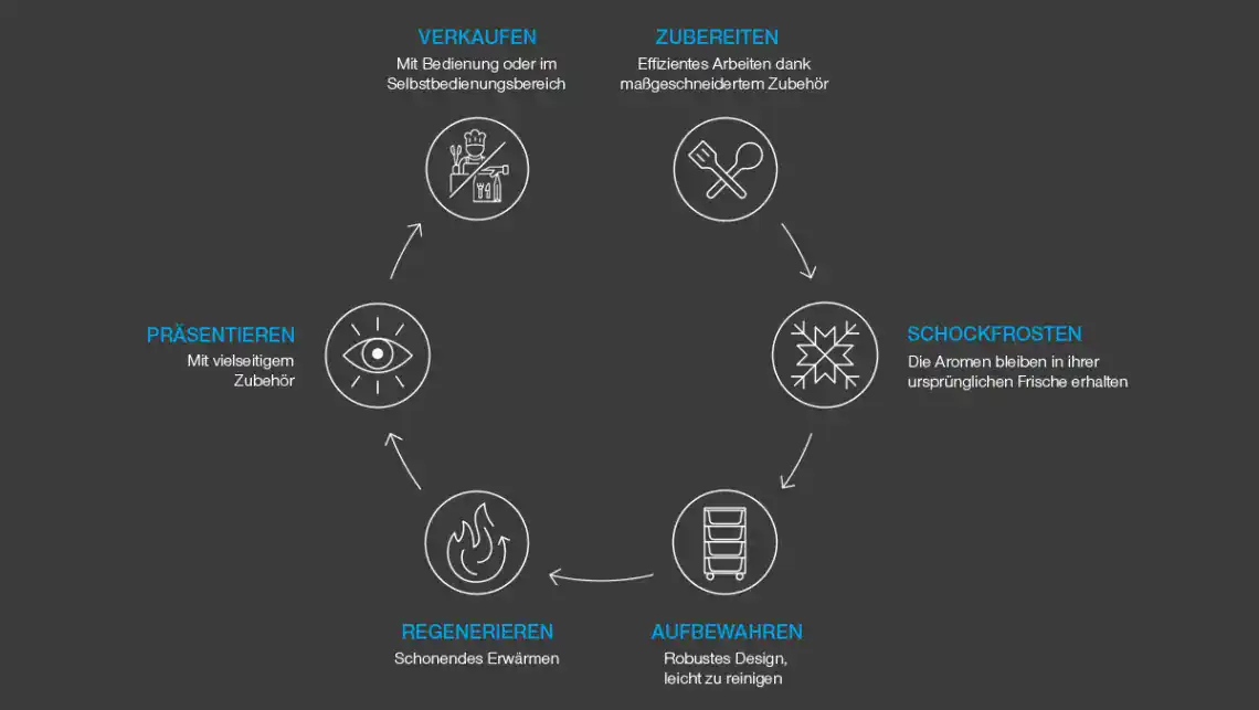 Nach der Zubereitung, Kühlung und Regeneration kommt es auf den entscheidenden Moment an: die Präsentation. Denn sie entscheidet, ob ein Produkt nur betrachtet – oder tatsächlich gekauft wird. Mit einer großen Auswahl an Zubehör, das speziell für eine verkaufsfördernde Warenpräsentation entwickelt wurde, sorgen wir für maximale Wirkung am Point of Sale. - Verkaufen