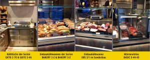 Zwei Backwarenkühlschränke, ein Backwarentiefkühlschrank, zwei (Unterbau-) Kühltische, drei Einbaukühlwannen und eine Einbauwärmevitrine sorgen für einen reibungslosen Arbeitsablauf und eine ansprechende Präsentation der Produkte.